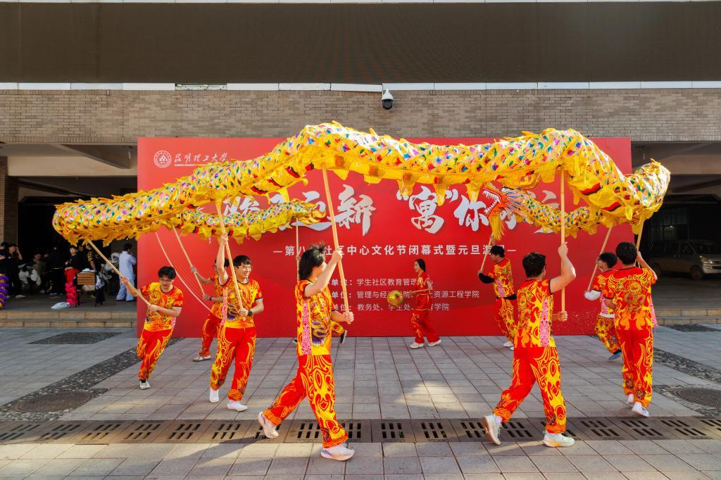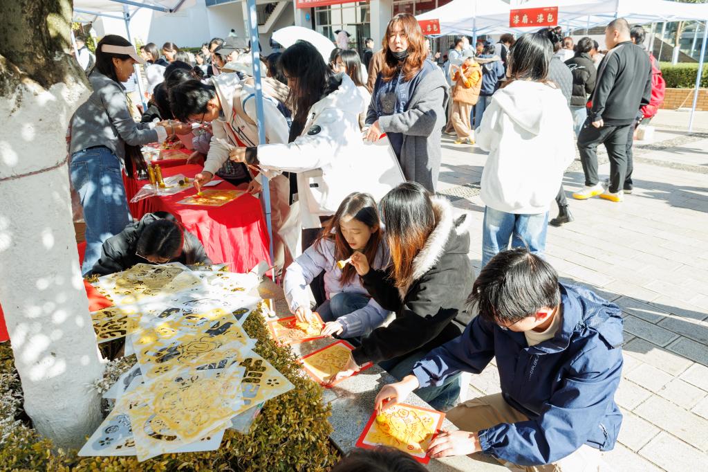 本次活动由闭幕式、元旦游园、非遗手作体验、写春联赠福字活动四个环节组成。闭幕式以舞龙舞狮等传统表演拉开序幕,变脸喷火技艺更是引得观众阵阵喝彩,让大家感受到了浓浓的节日氛围。元旦游园活动在呈贡、莲华两个校区分别设置不同类型的游园项目,非遗手作体验共设置点茶、糖画、漆扇、漆包等十余项非遗项目供师生体验,写春联、赠福字的活动现场热闹非凡,墨香四溢。现场还邀请国学社、印社开展汉服、篆刻展示体验活动。
